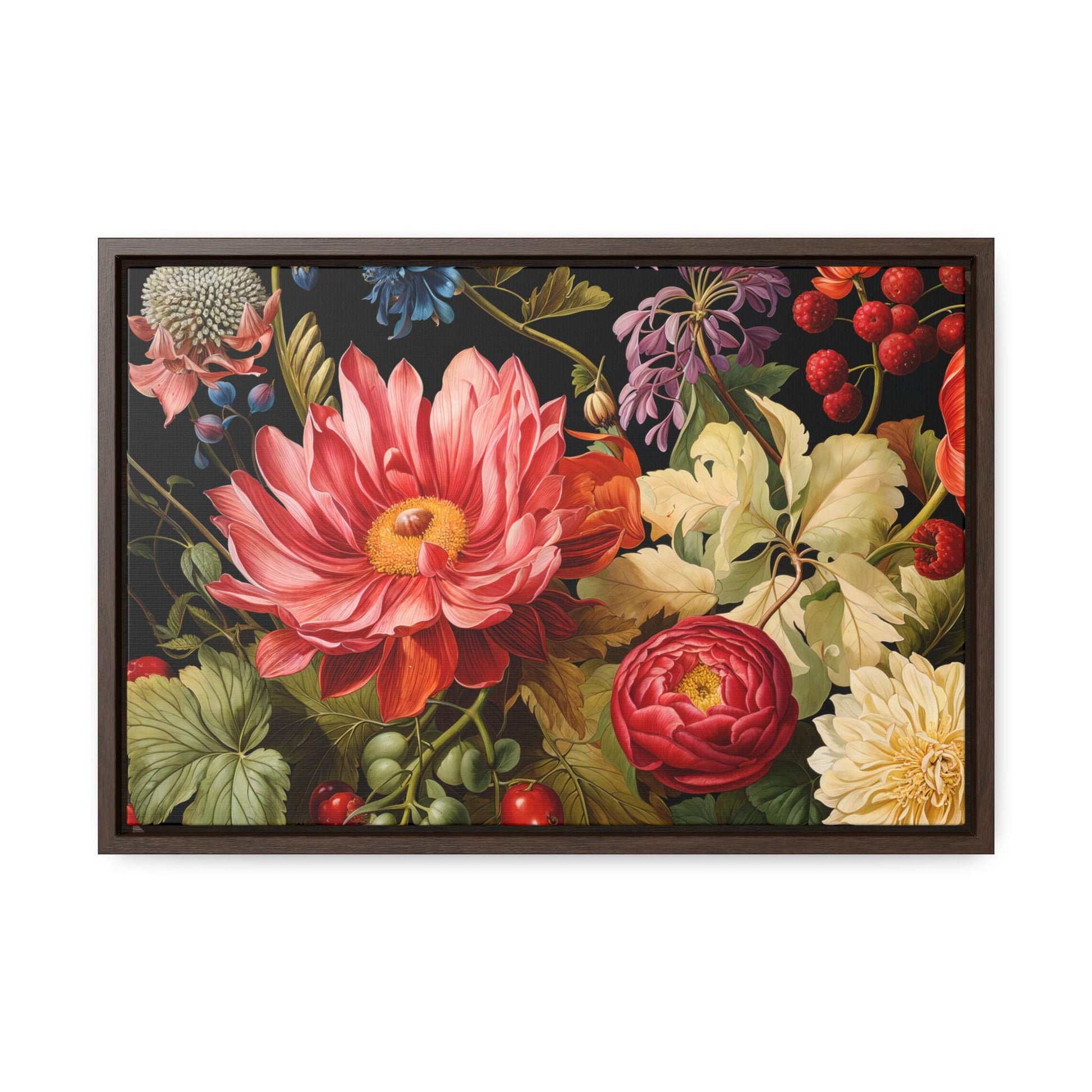 Exotic blossoms in deep reds and whites with amazing detail and luscious colors on a black background, framed in stunning black frame. This canvas wrap brings a touch of elegance and sophistication to any room, perfect for art lovers and those looking to add a pop of color to their space. Ideal for gifting on birthdays, anniversaries, or as a housewarming present.