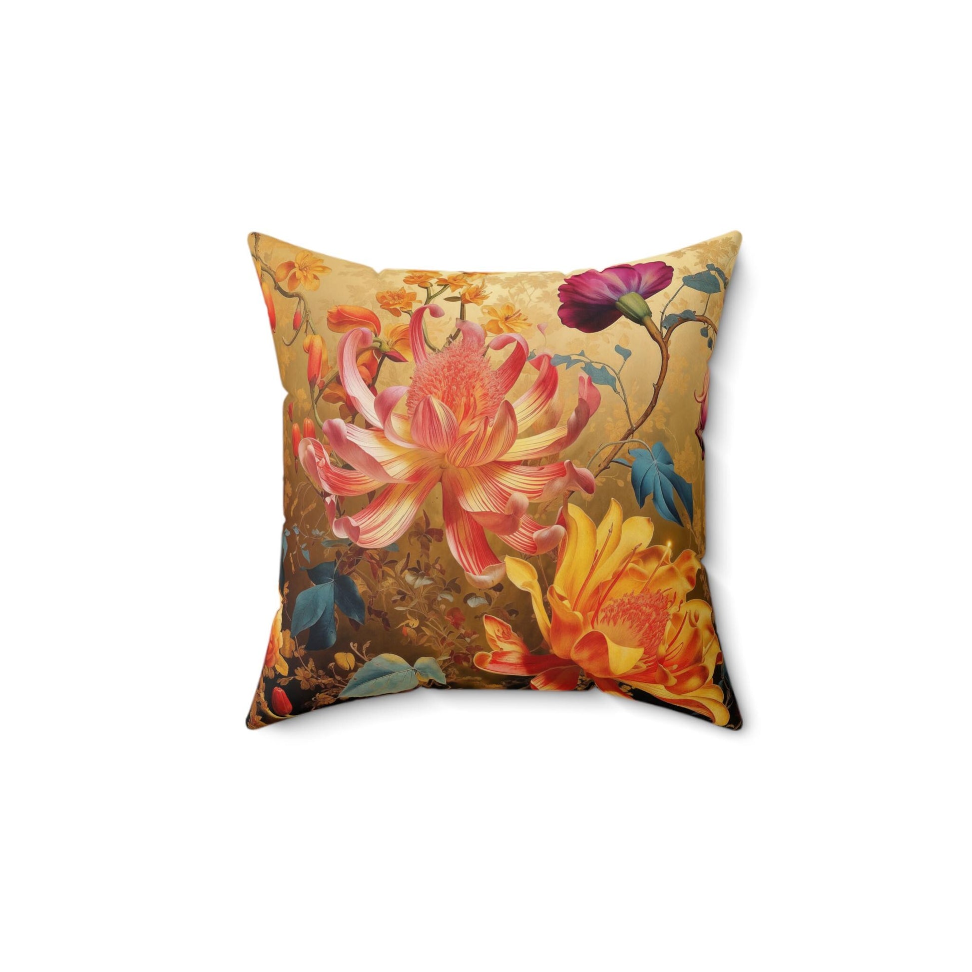 An elegant square pillow featuring exotic blooms in vibrant color against a luxurious gold background. This pillow adds a touch of luxury to any room and is perfect for those who love vibrant floral designs. Ideal for spring and summer home decor, as well as a great gift for garden enthusiasts or floral lovers.