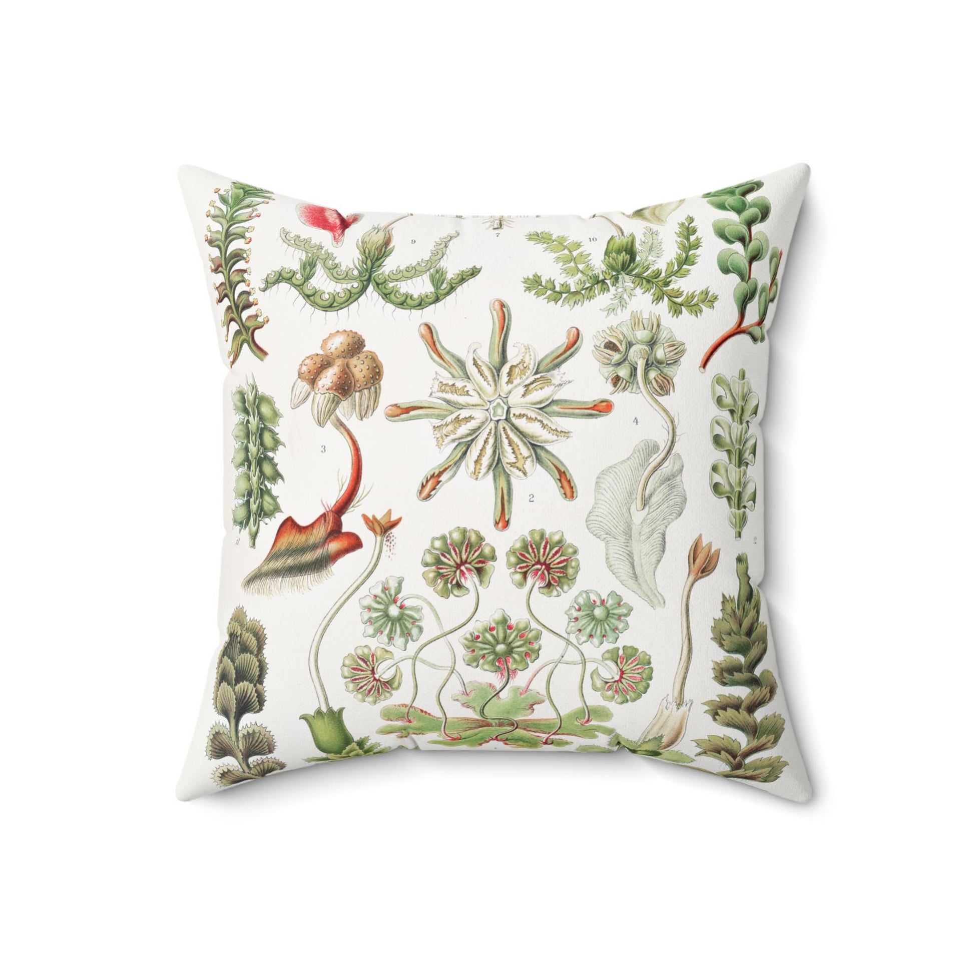 Whimsical square pillow featuring a botanical illustration of herbacious succulents on a white background. This pillow adds a touch of nature and charm to any room, perfect for plant lovers and those seeking a cozy and inviting atmosphere. Ideal for home decor, gifting on birthdays, housewarmings, or any special occasion.